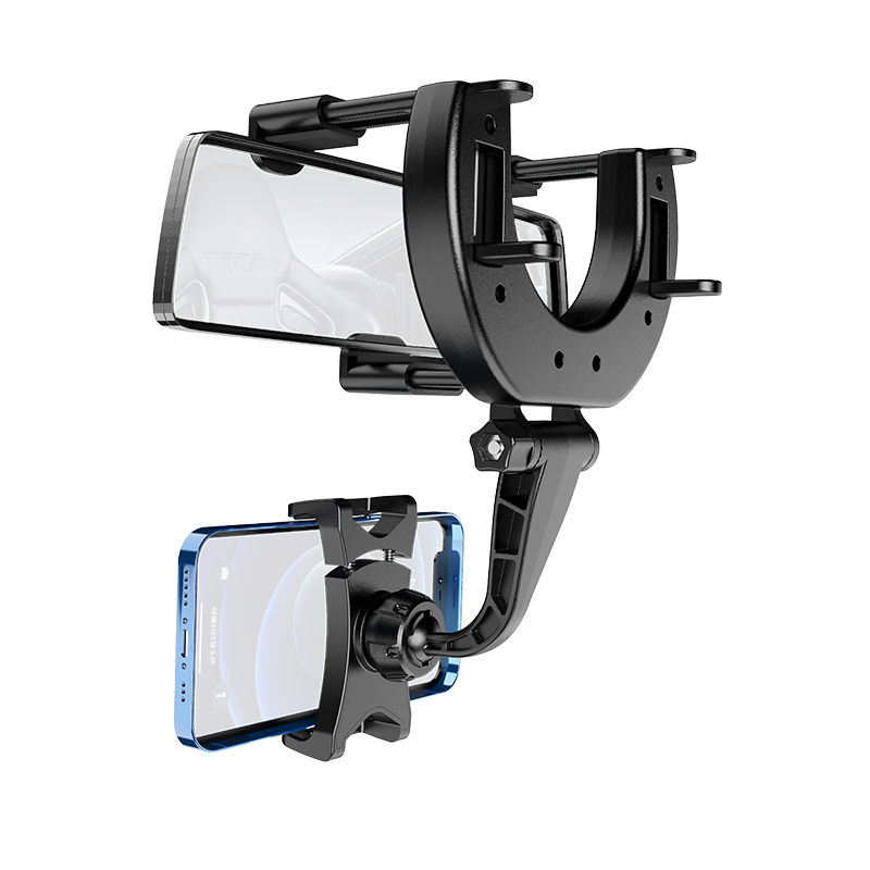 Univerzální klešťový držák s úchytem na zpětné zrcátko v autě v jednoduchém černém provedení.