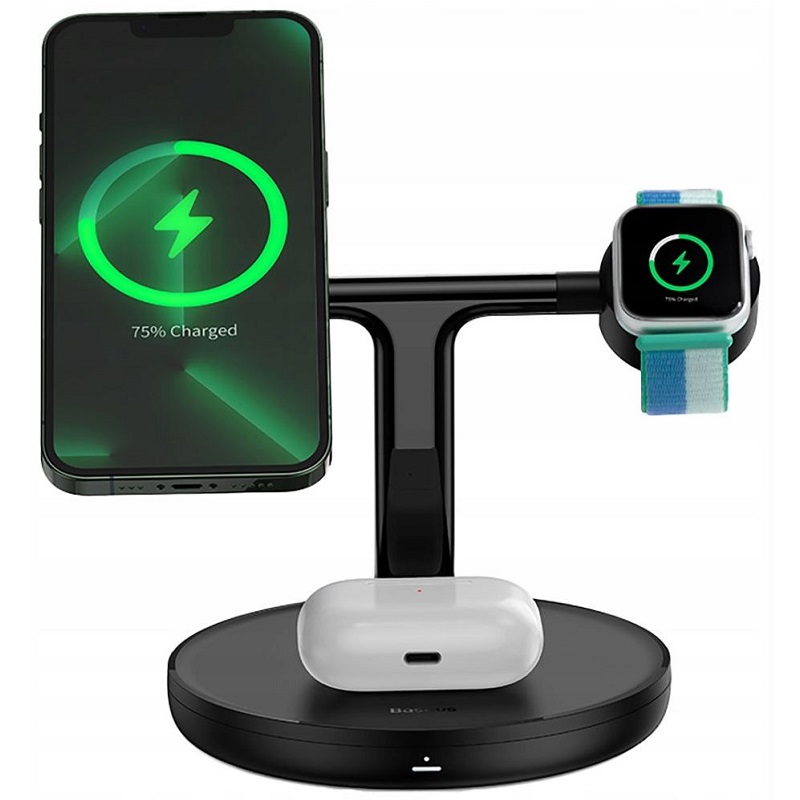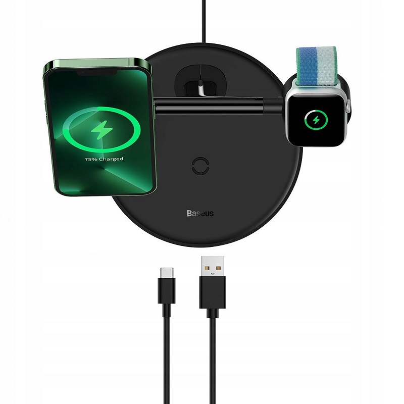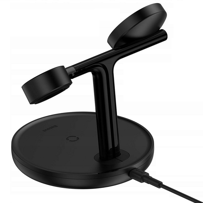 Nabíjecí stanice Baseus Swan 3v1 má vysoce stabilní základnu, která je vybavena další indukční cívkou pro nabíjení bezdrátových hodinek, nebo libovolného telefonu s podporou bezdrátového nabíjení.