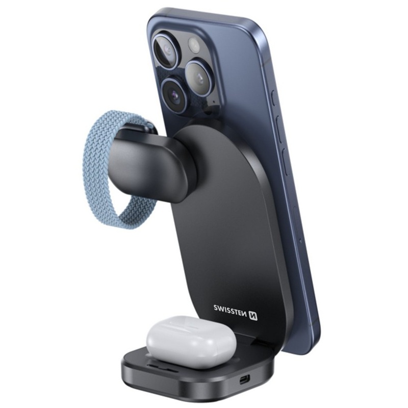 Nabíjecí stanice SWISSTEN MagBase bezdrátová Qi2 15W 3v1 iPhone/Apple Watch/Airpods skládací černá