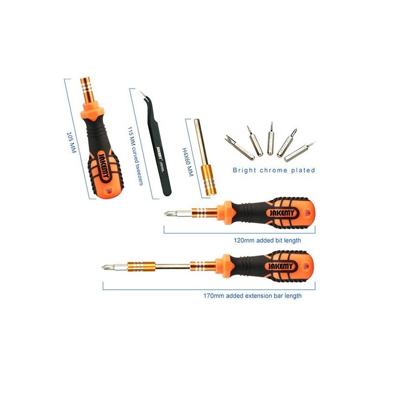 Sada nářadí JAKEMY JM-8101 určená pro opravy elektroniky, jako jsou telefony, tablety, počítače, pevné disky, ale také MP4, fotoaparáty a brýle. Nářadí má vysokou tvrdost a sílu, které uspokojí i náročného opraváře.
