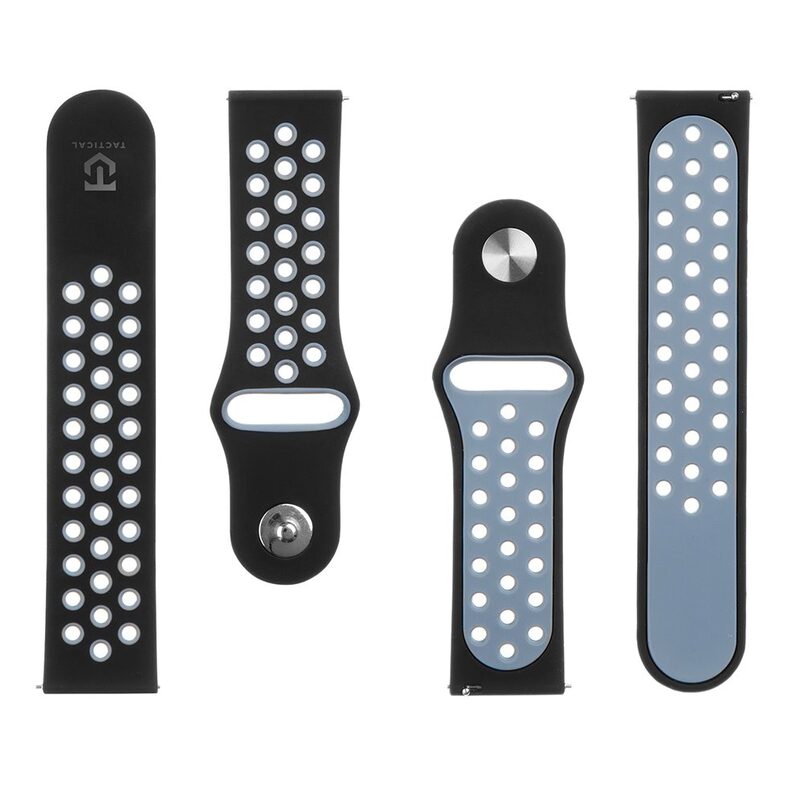Náhradní silikonový řemínek s kolíčkovým zapínáním značky Tactical určený pro chytré hodinky o šířce řemínku 22 mm v provedení Black / Grey.