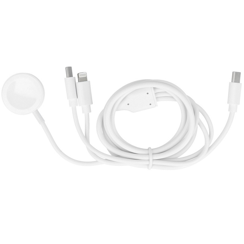 Praktický dobíjecí kabel 3 v 1 má nabíjecí kabel pro iPhone s konektorem Lightning, nabíjecí kabel USB-C a bezdrátovou nabíječku Apple iWatch. Kabel vám umožní nabíjet až 3 zařízení současně: iPhone (iPad), zařízení s USB-C konektorem a chytré hodinky. Delší délka kabelu vám umožňuje pohodlně pracovat se smartphonem i při nabíjení.
