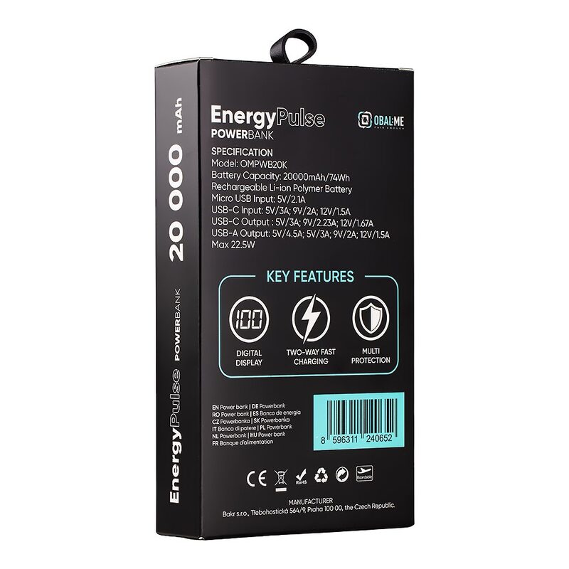 Kompaktní a elegantní Powerbanka OBAL:ME EnergyPulse o kapacitě 20.000 mAh se může pochlubit výkonným nabíjecím výstupem 22.5 W, který vám poskytne bleskurychlé nabíjení, abyste se mohli okamžitě vrátit do provozu. Díky své kapacitě dokáže tato Powerbanka nabít váš smartphone, tablet nebo jiná zařízení víckrát, než je bude potřeba dobít.